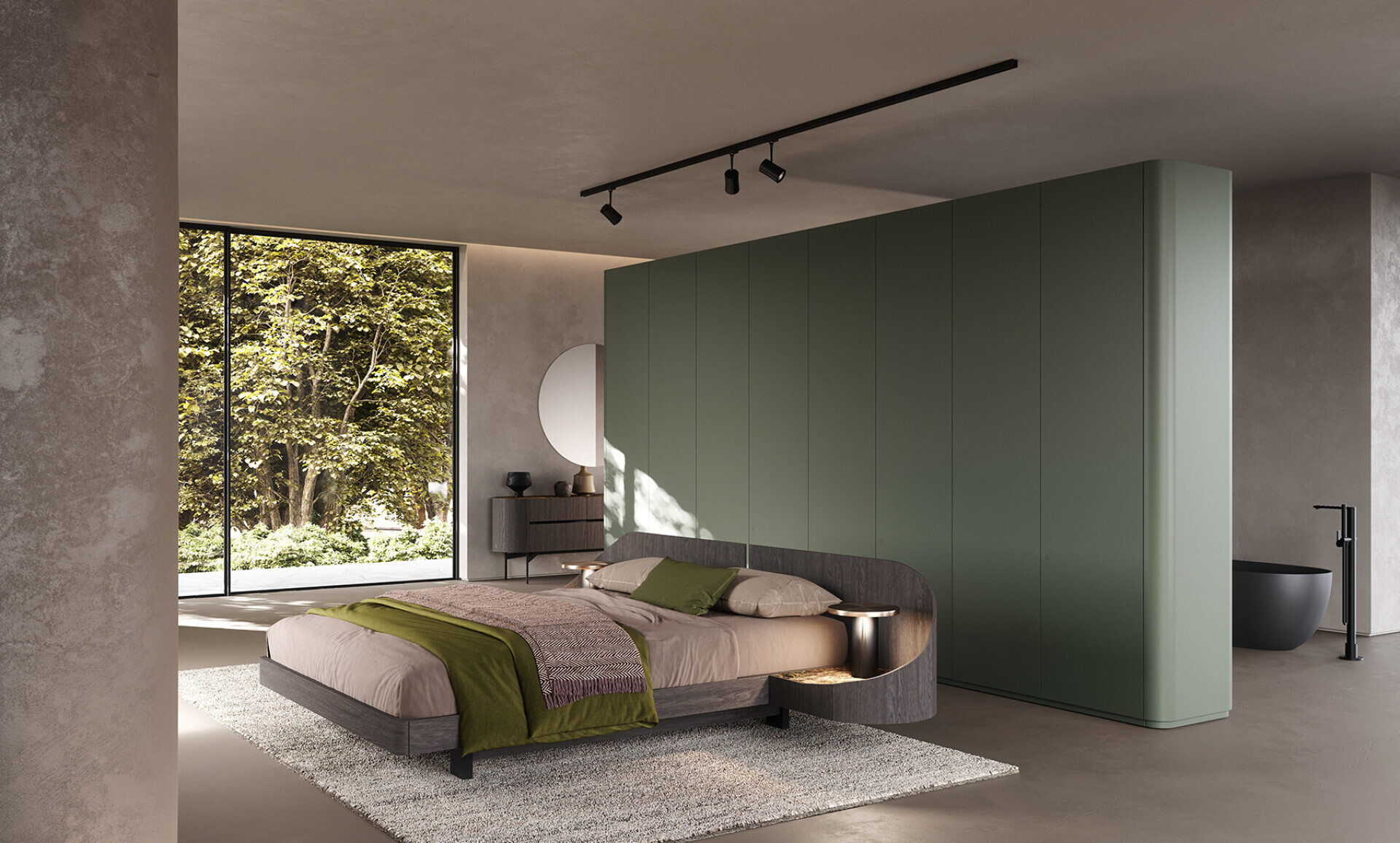 Letto Ottanta contenitore in legno di quercia carbone con comodini cassetti coordinati,