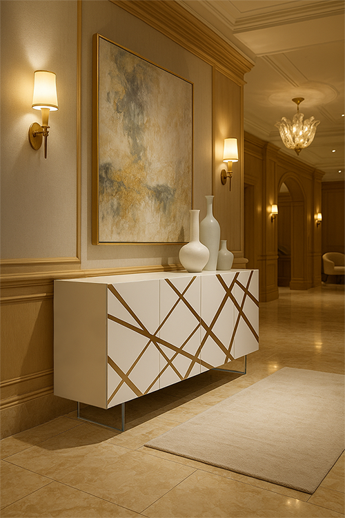 Madia con 4 ante battenti in bassorilievo 35, finitura bronzo graffiato e piedi in vetro.
