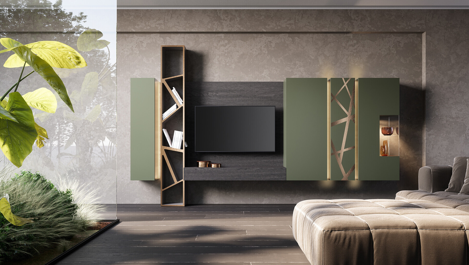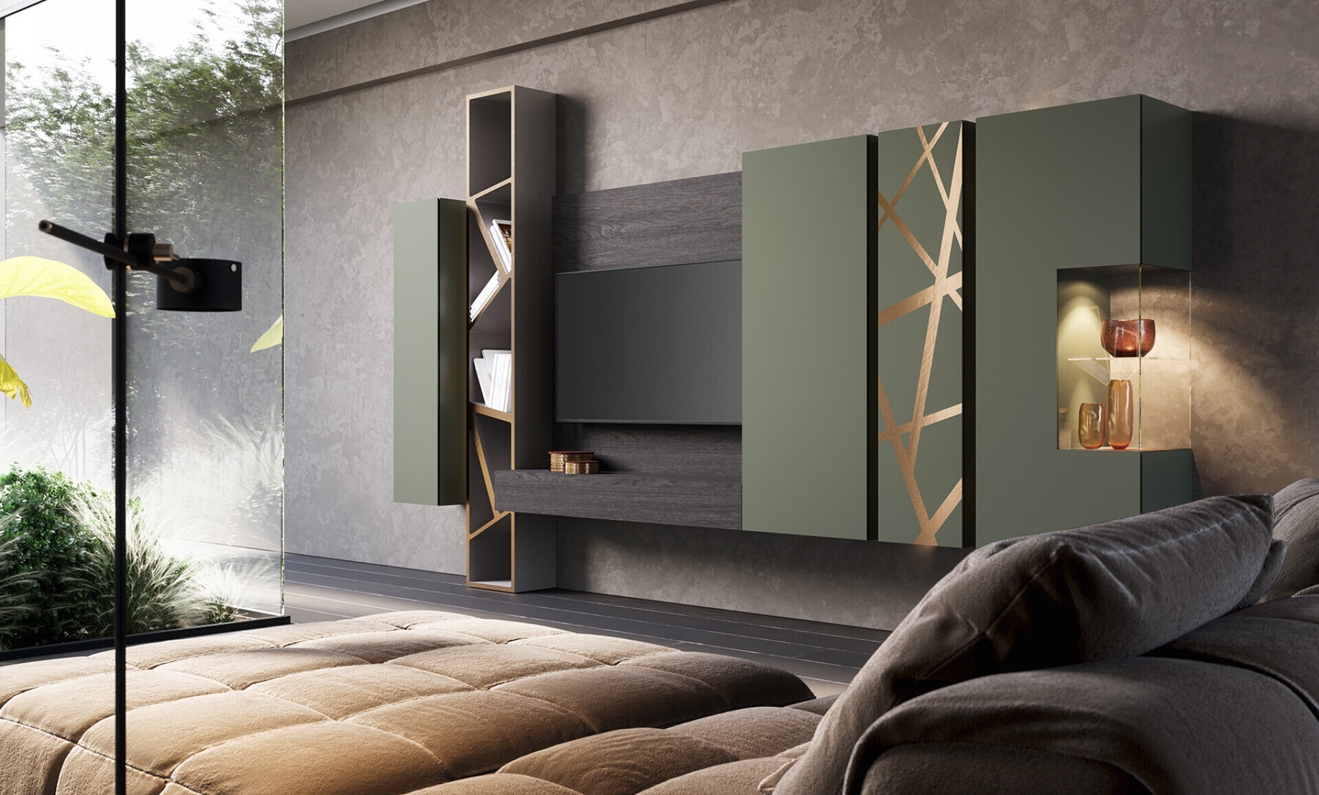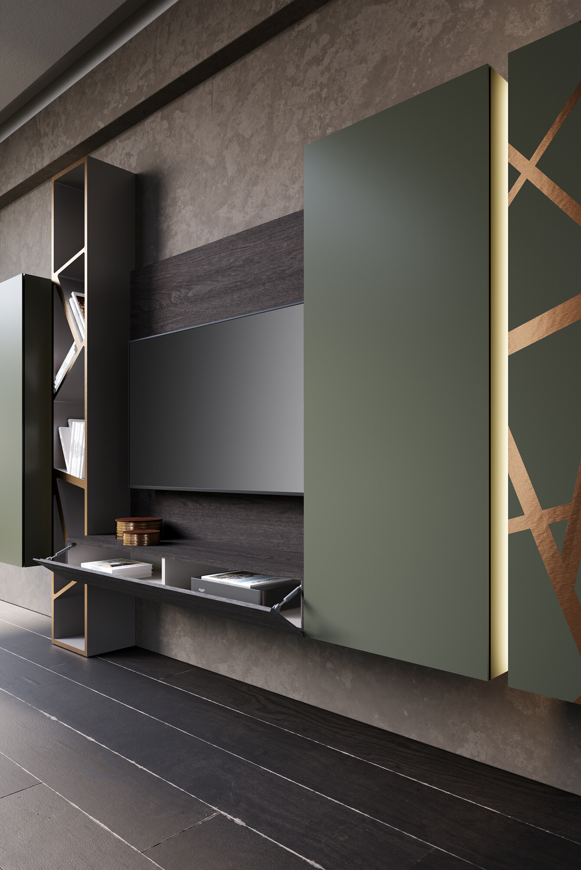 composizione con kit luci l. 393 h. 150 p. 40 laccato opaco verde prussia. Anta bassorilievo 35 bronzo graffiato.
